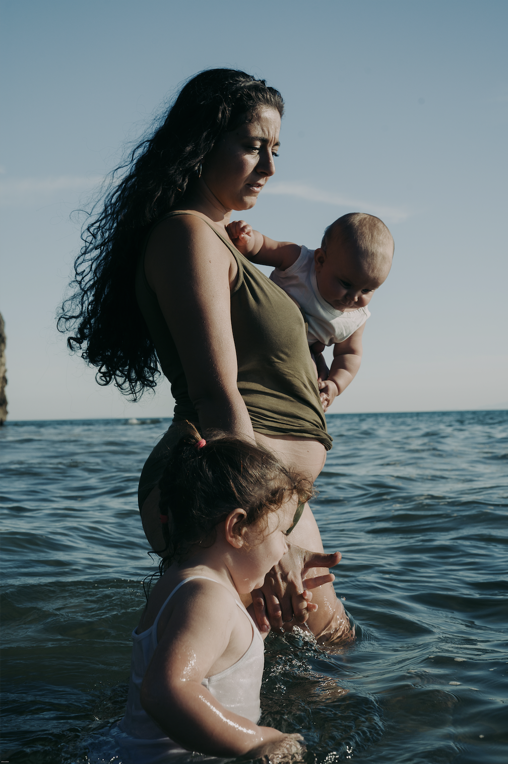 À travers cette série, j’observe sur ces plages un geste universel: celui d’une mère accompagnant ses enfants, les guidant à se jeter à l’eau.